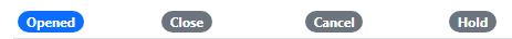 These will be labeled Open/Opened, Close/Closed, Cancel/Cancelled, and Hold/On Hold depending on the current status. Further, the current status will have a blue background and the others will be gray. To change the status, simply click on the appropriate pill.